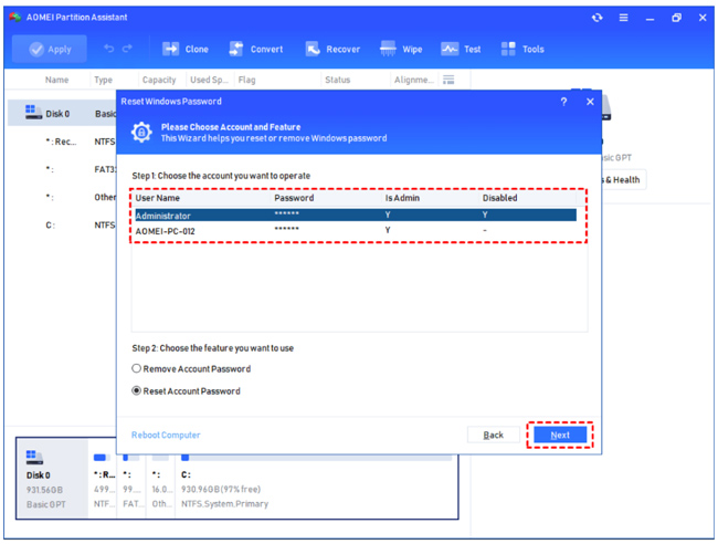 Step 6 – Insert the USB drive into the Windows computer where the password needs to be reset and boot your PC from the USB. Then, AOMEI Partition Assistant will open automatically. Click “Reset Password” again and select the target operating system. Then click “Next”.